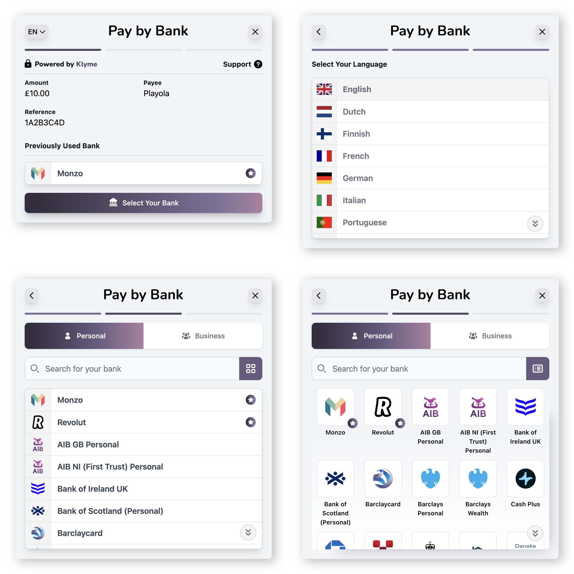 <html><head><!-- Import the SDK --><!-- Sandbox --><!-- <script src="https://widget.klyme.io/test.js"></script> --><!-- Production --><script src="https://widget.klyme.io/prod.js"></script><title>Klyme Example</title></head><body><!-- Widget --><klyme-widget id="INSERT UUID HERE"></klyme-widget></body></html>const axios = require('axios');const qs = require('qs');let data = qs.stringify({'merchantUuid': '3fe3539cba3a59731be57905b8a12345','reference': 'Test 1''amount': '2.99','currency': 'GBP','redirectUrl': 'https://klyme.io/payment-confirmation';let config = { method: 'post', url: 'http://api.klyme.io/api/v1/payment-auth-requests', headers: { 'Content-Type': 'application/x-www-form-urlencoded', 'Authorization': '••••••' },data: data};axios.request(config) .then((response) => { console.log(JSON.stringify(response.data));}).catch((error) => {console.log(error);});<?php$curl = curl_init();$data = array('merchantUuid' => '3fe3539cba3a59731be57905b12345','reference' => 'Test','amount' => 2.99,'currency' => 'GBP','redirectUrl' => 'https://klyme.io/payment-confirmation');curl_setopt_array($curl, array(CURLOPT_URL => 'http://api.klyme.io/api/v1/payment-auth-requests',CURLOPT_RETURNTRANSFER => true,CURLOPT_ENCODING => '',CURLOPT_MAXREDIRS => 10,CURLOPT_TIMEOUT => 0,CURLOPT_FOLLOWLOCATION => true,CURLOPT_HTTP_VERSION => CURL_HTTP_VERSION_1_1,CURLOPT_CUSTOMREQUEST => 'POST',CURLOPT_POSTFIELDS => http_build_query($data),CURLOPT_HTTPHEADER => array('Content-Type: application/x-www-form-urlencoded','Authorization: Basic ••••••'),));$response = curl_exec($curl);curl_close($curl);echo $response;?>import java.net.URI;import java.net.http.HttpClient;import java.net.http.HttpRequest;import java.net.http.HttpResponse;import java.net.http.HttpHeaders;import java.util.Map;import java.util.stream.Collectors;public class ApiRequest {public static void main(String[] args) {String url = "https://api.klyme.io/api/v1/payment-auth-requests"; Map<String, String> data = Map.of( "merchantUuid", "3fe3539cba3a59731be57905b8a12345", "reference", "Test", "amount", "2.99", "currency", "GBP", "redirectUrl", "https://klyme.io/payment-confirmation" ); String formData = data.entrySet().stream() .map(entry -> entry.getKey() + "=" + entry.getValue()) .collect(Collectors.joining("&")); HttpClient client = HttpClient.newHttpClient(); HttpRequest request = HttpRequest.newBuilder() .uri(URI.create(url)) .header("Content-Type", "application/x-www-form-urlencoded") .header("Authorization", "Bearer ••••••") .POST(HttpRequest.BodyPublishers.ofString(formData)) .build();try {HttpResponse<String> response = client.send(request, HttpResponse.BodyHandlers.ofString()); System.out.println(response.body()); } catch (Exception e) { e.printStackTrace(); } }}using System;using System.Collections.Generic;using System.Net.Http;using System.Net.Http.Headers;using System.Threading.Tasks;class Program { static async Task Main(string[] args) { string url = "http://api.klyme.io/api/v1/payment-auth-requests"; var data = new Dictionary<string, string> { { "merchantUuid", "3fe3539cba3a59731be57905b12345" }, { "reference", "Test" }, { "amount", "2.99" }, { "currency", "GBP" }, { "redirectUrl", "https://klyme.io/payment-confirmation" } }; var content = new FormUrlEncodedContent(data); using (HttpClient client = new HttpClient()) { client.DefaultRequestHeaders.Authorization = new AuthenticationHeaderValue("Basic", "••••••"); try { HttpResponseMessage response = await client.PostAsync(url, content); string responseString = await response.Content.ReadAsStringAsync(); Console.WriteLine(responseString); } catch (Exception ex) { Console.WriteLine("An error occurred: " + ex.Message); } } }}